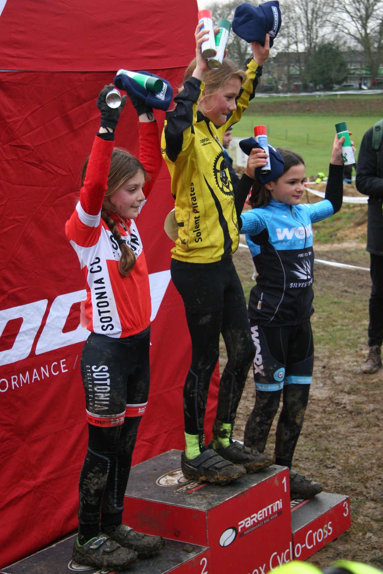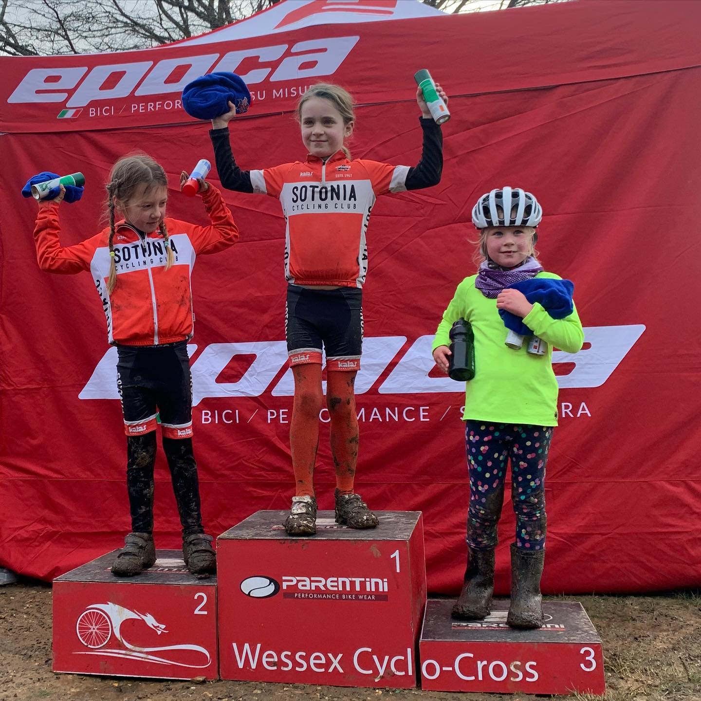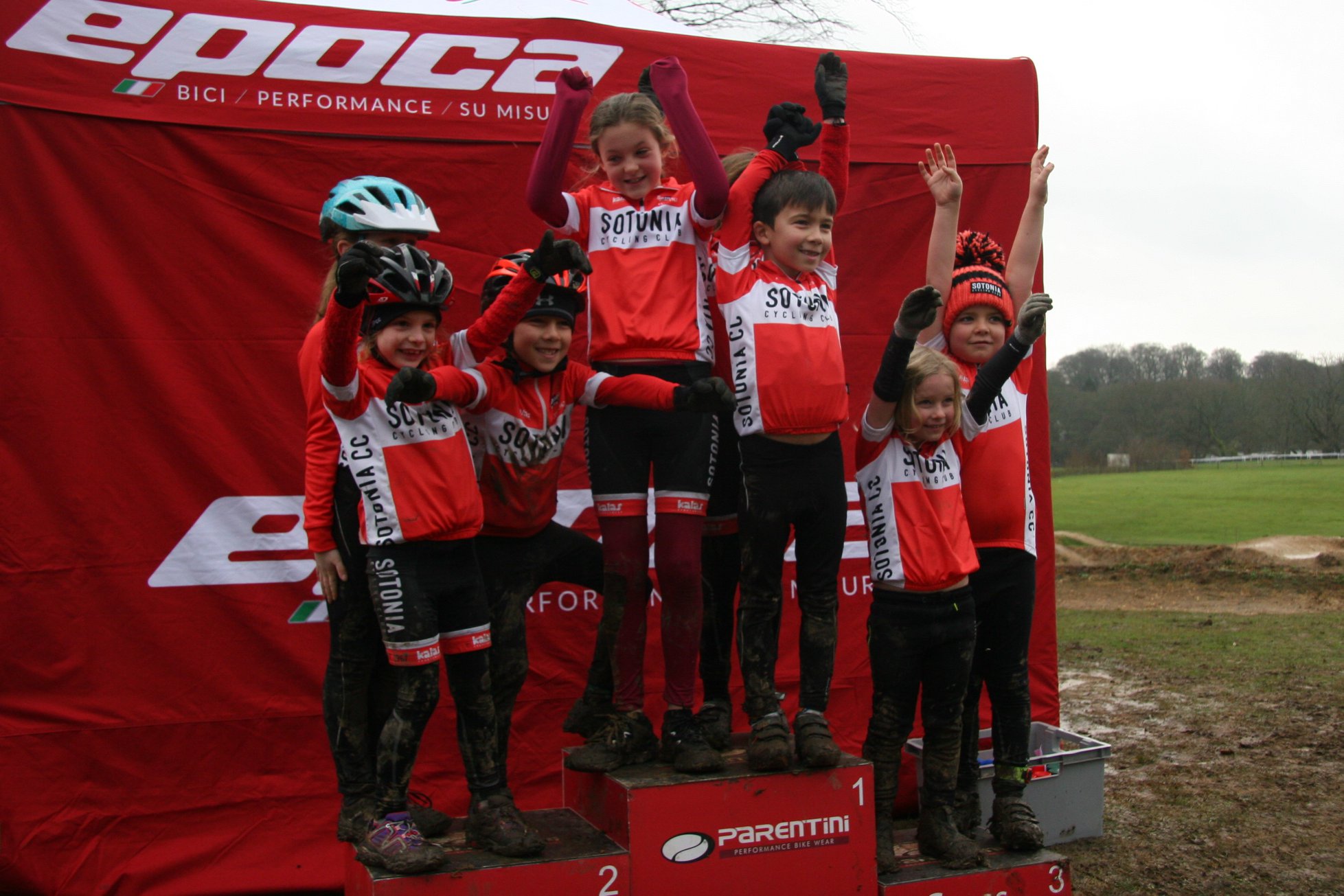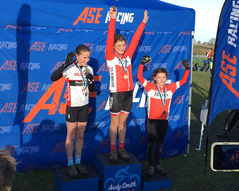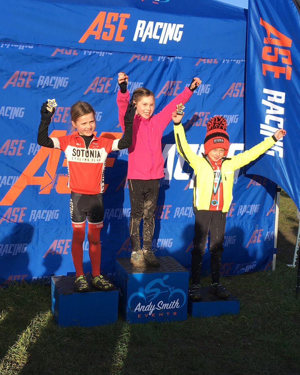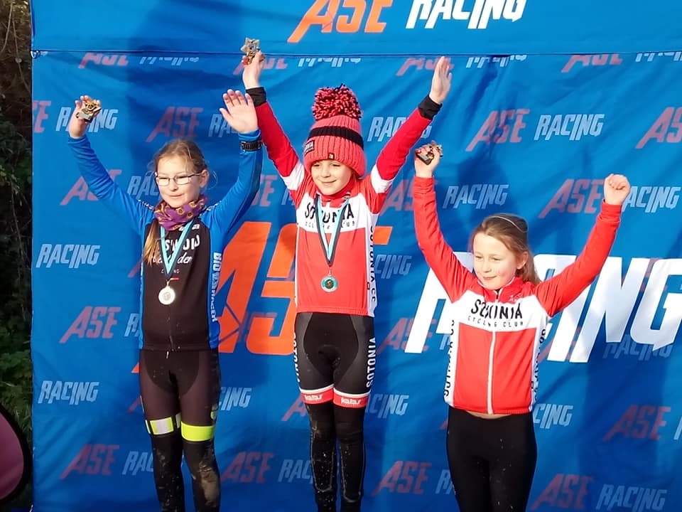 The Sotonia U8 girls changed finishing position every race this year and this time Tilly came out on top finishing in first place with Eve Carline in second place. Billy has gotten used to being on the podium this year but in the last race of the season he finished behind a sea of Blue Cotswolds Veldrijden riders in 4th place.